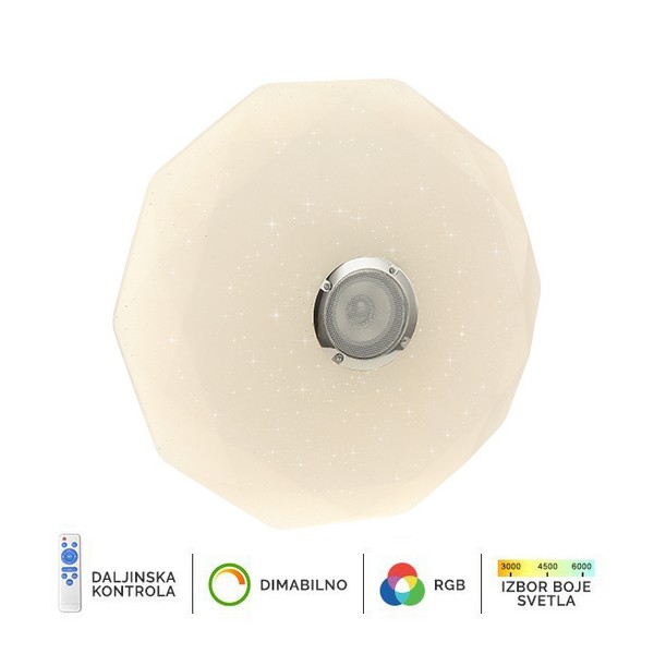 LED plafonjera Forma LP-801-28 sa zvučnikom dolazi u jačini od 28W sa integrisanim LED svetlom.Takođe poseduje daljinski upravljač koji omogućava podešavanje temperature boje svetlosti od 3000K do 6000K, RGB izbor boja, kao i dimovanje.Izrađena je od plastike u dimenzijama Ø400mm. Putem mobilne aplikacije povežite se sa nekim od smart uređjaja kao što su mobilni, tablet ili laptop.Možete slušati radio, YouTube,podešavati jačinu zvuka.Idealna je za dnevne boravke, spavaće sobe, kancelarije i hodnike.