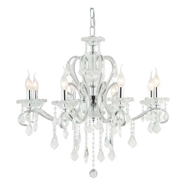 stakla, ovaj luster dolazi u hrom boji, što omogućava lako uklapanje u različite stilove enterijera. Stakleni detaljii koji ga krase dodaju mu sofisticiranost i prefinjenost, stvarajući blistav efekat u prostoru. Opremljen je sa osam E14 grla, pružajući prijatno i ujednačeno osvetljenje. Sa dimenzijama 1050x750x670 koje omogućavaju da bude centralni element prostorije, ovaj luster je savršen izbor za enterijere u kojima se kombinuju klasičan i moderan dizajn.